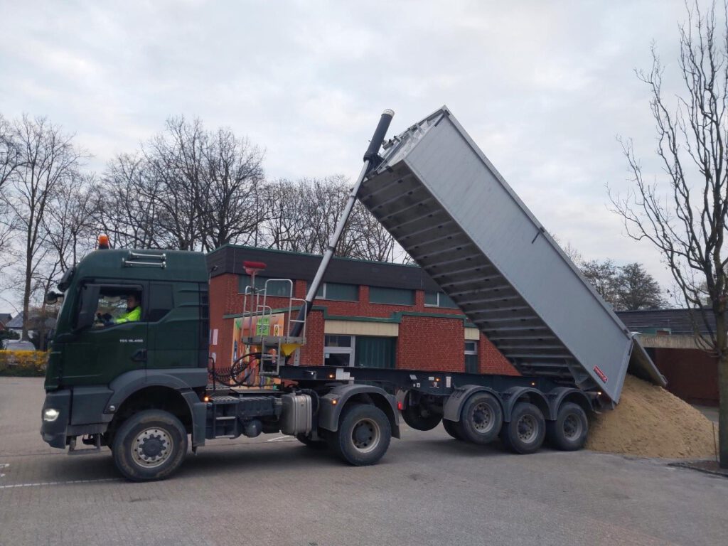 Und hier kommt die Firma Venneker ins Spiel. Früh morgens im März stand ein großer LKW der Firma auf dem Schulhof und hat uns einen kompletten Sattelzug Spielplatzsand als Spende vorbeigebracht. Hierfür möchten wir uns ganz herzlich bedanken!!! Die Schüler*innen, Bewohner*innen und Besucher*innen der Kinderheilstätte werden ihre Freude daran haben!